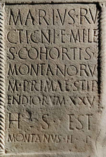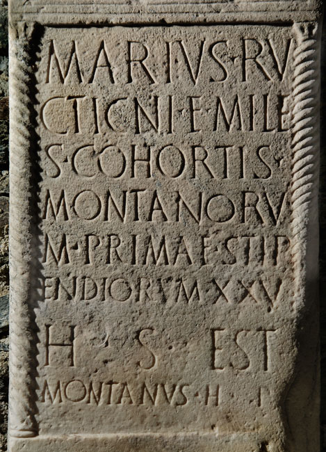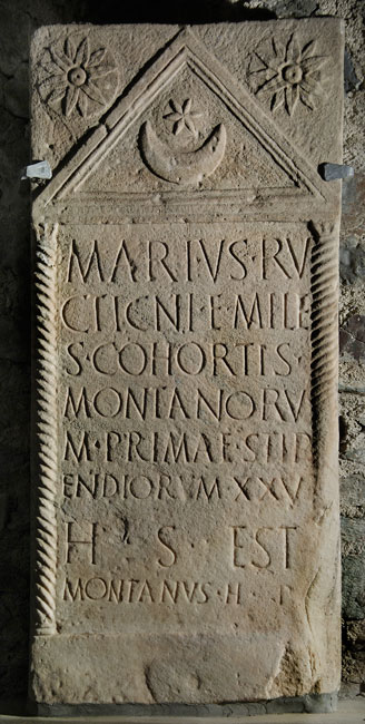 - Marius Ru/cticni f(ilius) mile/s cohortis / Montanoru/m primae stip/endiorum XXV / h(ic) s(itus) est / Montanus h(eres) p(osuit)