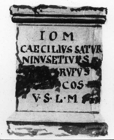 - I(ovi) o(ptimo) m(aximo) ?S(---) / Caecilius Satur/ninus et Iuli/us Rufus / b(ene)[f(iciarii)] co(n)s(ularis) / v(otum) s(olverunt) l(ibentes) m(erito)