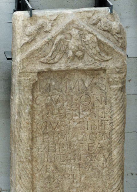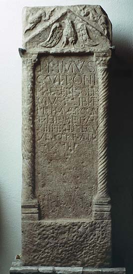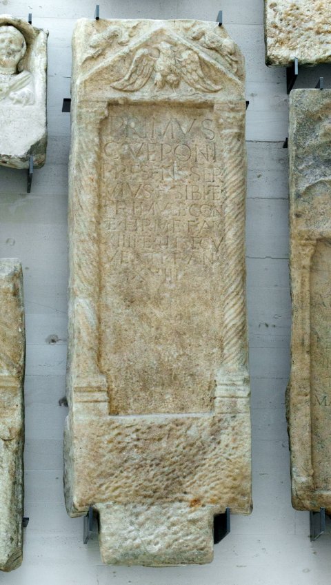 - Primus / C(ai) Veponi(i) / Pr(a)esentis ser(vus) / vi(v)us f(ecit) sibi et / Primul(a)e con(iugi) / et Firm(a)e f(iliae) an(norum) / XIIII et Insecu/venti f(ilio) an(norum) / XVIII