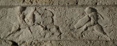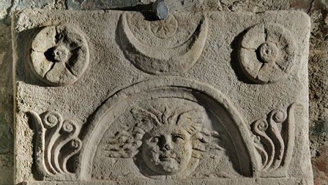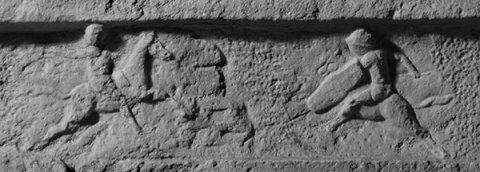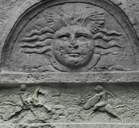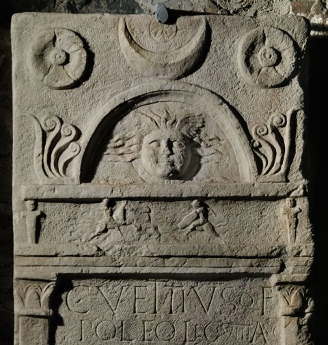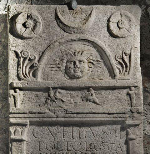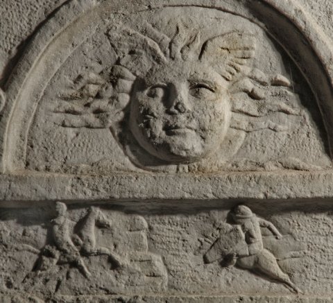- Eingeschriebenes, halbrundes Giebelfeld mit Gorgoneion, seitlich Halbpalmette, oben Mondsichel zwischen Rosetten. Im Zwischenfries Reiter (Soldat): zwischen Hermen zwei Reiter im Kampf, rechts mit Waffen (Helm, Schild, Lanze), links nackt. Schriftfeld zwischen Pilastern. Im Sockelbild neun Phalerae an Riemen, darüber zwei Torques und Armreifen (armillae).