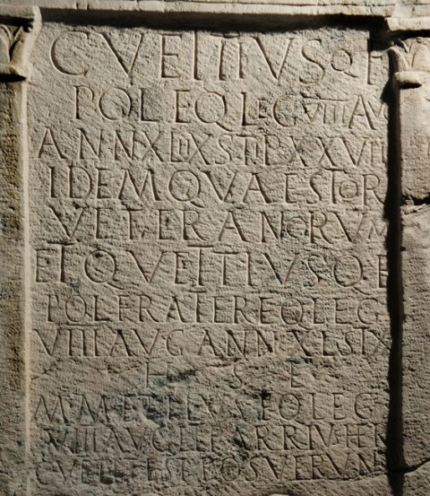- C(aius) Vettius Q(uinti) f(ilius) / Pol(lia) eq(ues) leg(ionis) VIII Aug(ustae) / ann(orum) XLIIX stip(endiorum) XXVIII / idem quaestor / veteranorum / et Q(uintus) Vettius Q(uinti) f(ilius) / Pol(lia) frater eq(ues) leg(ionis) / VIII Aug(ustae) ann(orum) XL st(ipendiorum) XX / h(ic) s(itus) e(st) / M(arcus) Metilius eq(ues) leg(ionis) / VIII Aug(ustae) et P(ublius) Arrius her(edes) / C(ai) Vetti(i) test(amento) posuerunt