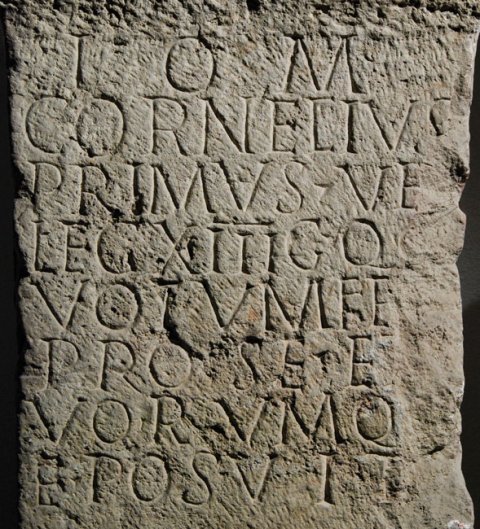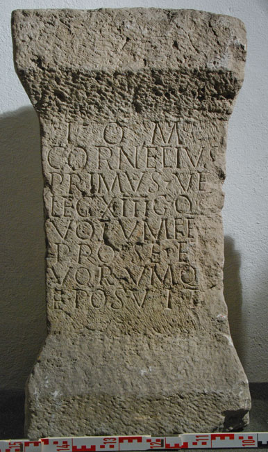 - I(ovi) o(ptimo) m(aximo) / Cornelius / Primus vet(eranus) / leg(ionis) XIII G(eminae) q(u)ot / votum fecit / pro se et s/uorumqu/e posuit