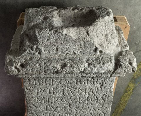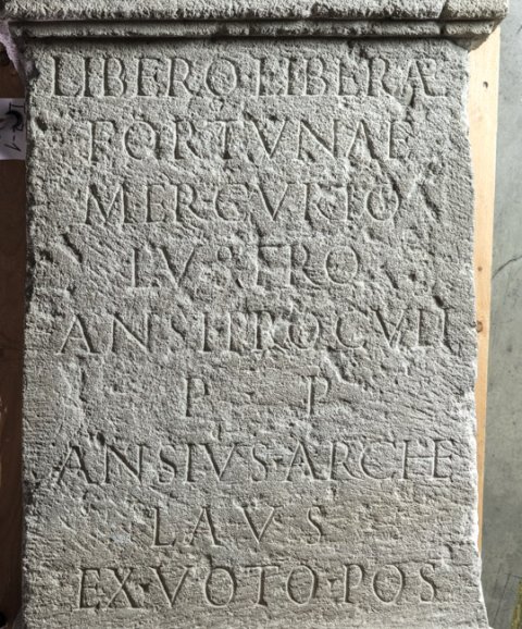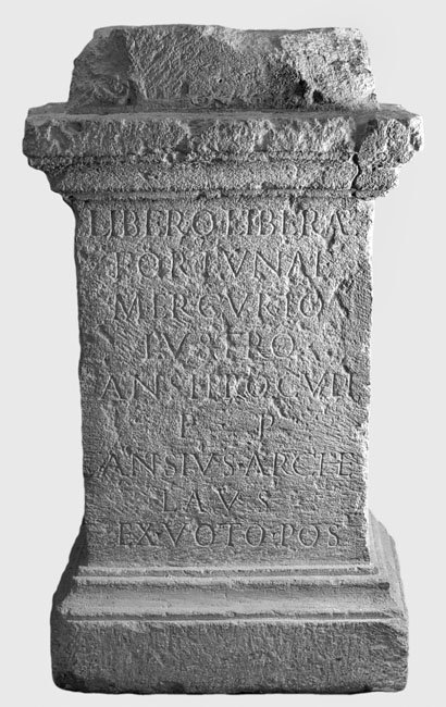 - Libero Liberae / Fortunae / Mercurio / lustro / Ansi Proculi / p(rimi) p(ili) / Ansius Arche/laus / ex voto pos(uit)