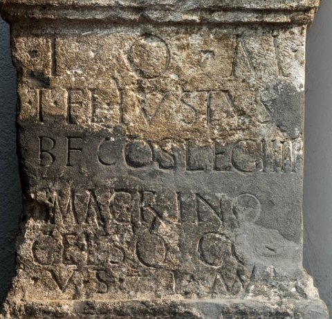 - I(ovi) O(ptimo) M(aximo) / T(itus) Fl(avius) Iustus / [b(ene)f(iciarius) c]o(n)s(ularis) leg(ionis) IIII / Macrino [et] / Celso co(n)[s(ulibus)] / v(otum) s(olvit) l(ibens) m(erito)