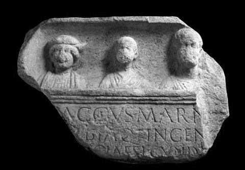 - Familie: in Rechtecknische Büsten eines Ehepaares mit Kind. Links einheimische Frau: Haube, Umhang, auf der Brust Doppelknopffibel, Halsring mit Lunula. In der Mitte Mädchen: offenes Haar, Halsring mit Lunula. Rechts bärtiger Mann.