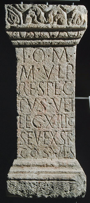 - I(ovi) o(ptimo) m(aximo) / M(arcus) Ulp(ius) / Respec/tus vet(eranus) / leg(ionis) XIII G(eminae) / Sev(erianae) ex str(atore) / co(n)s(ularis) v(otum) l(ibens) s(olvit)