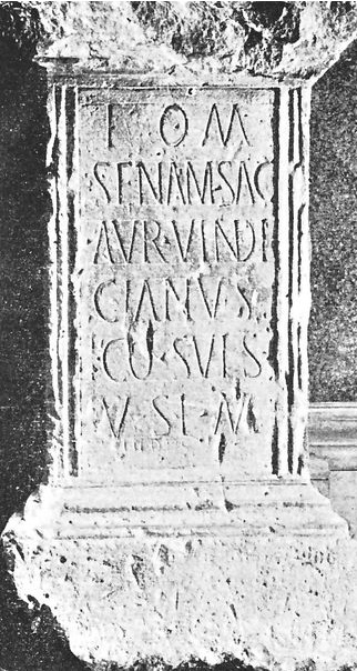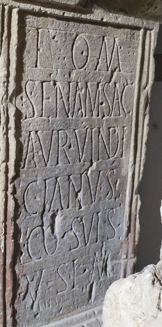 - I(ovi) O(ptimo) M(aximo) / Senam() sac(rum) / Aur(elius) Vindi/cianus / co(n!) suis / v(otum) s(olvit) l(ibens) m(erito)