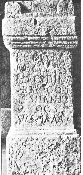 - I(ovi) O(ptimo) M(aximo) / M(arcus) Ulp(ius) / Placidinu[s] / b(ene)f(iciarius) co(n)s(ularis) / II Silanis / co(n)s(ulibus) / v(otum) s(olvit) l(ibens) m(erito)