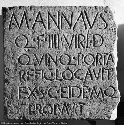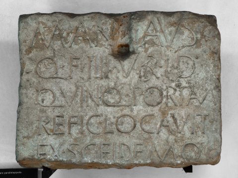 - M(arcus) Annaus / Q(uinti) f(ilius) IIIIvir i(ure) d(icundo) / quinq(uennalis) portam / refic(iundam) locavit / ex s(enatus) c(onsulto) eidemq(ue) / probavit // M(arcus) Annaus / Q(uinti) f(ilius) IIIIvir i(ure) d(icundo) / quinq(uennalis) portam / refic(iundam) locavit / ex s(enatus) c(onsulto) eidemq(ue) / [probavit]