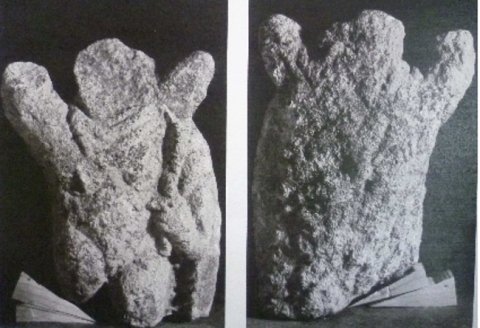 - Mythische Figur (Silvanus ?): stehende männliche Gestalt mit Mantel um die Schultern, rechter Arm war erhoben, im linken Arm Pedum ?