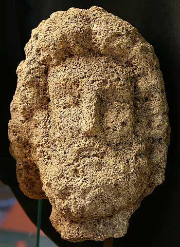 - Mythische Figur (Jupiter): männlicher bärtiger Kopf mit gelocktem Haar und Vollbart. Teil eines Reliefs.