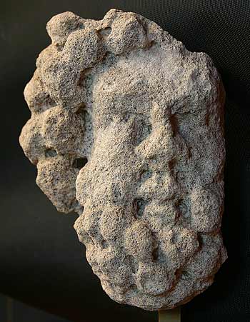 - Mythische Figur (Jupiter): männlicher Kopf mit gelocktem Haar und Vollbart.