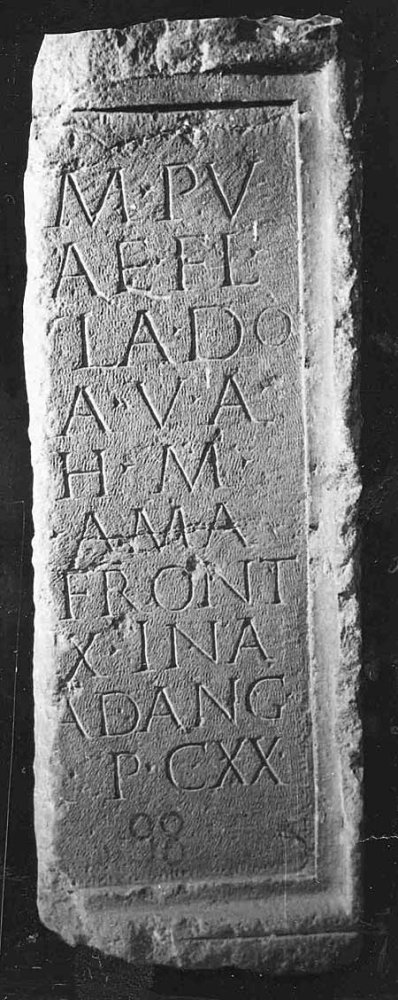 - [---] M() Pu/[---]ae Fl(avi--) / [---]ula do/[?mo ---]a v(ixit) a(nnis) / [---] h(oc) m(onumentum) / [?h(eredem) n(on) s(equentur)] a ma/[?cer(ia) -- in] front(e) / [pedes --]X in a/[gro pedes ---] ad ang(ulos) / [---]r(..) p(edes) CXX