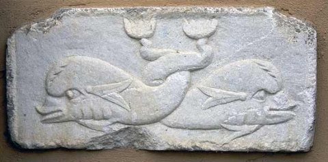 - zwei Delphine mit umeinander geschlungenen Schwänzen