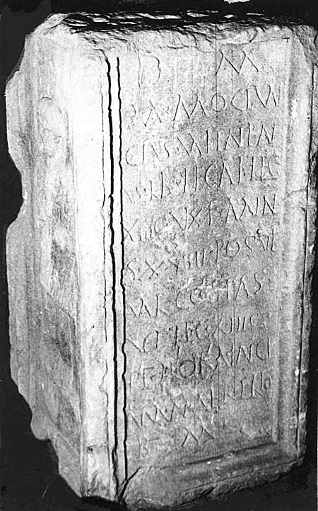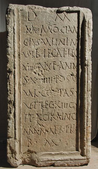 - D(is) M(anibus) / M(arcus) Mociun/cius Valentin/us lib(rarius) legati leg(ionis) / XIII G(eminae) v(i)xit ann(i)/s XXVIIII posuit / Val(erius) Co(n)sta(n)s / vet(eranus) leg(ionis) XIII G(eminae) / et Floria Inge/nua mater filio / b(ene) m(erenti)