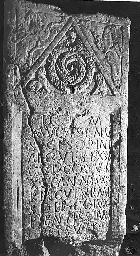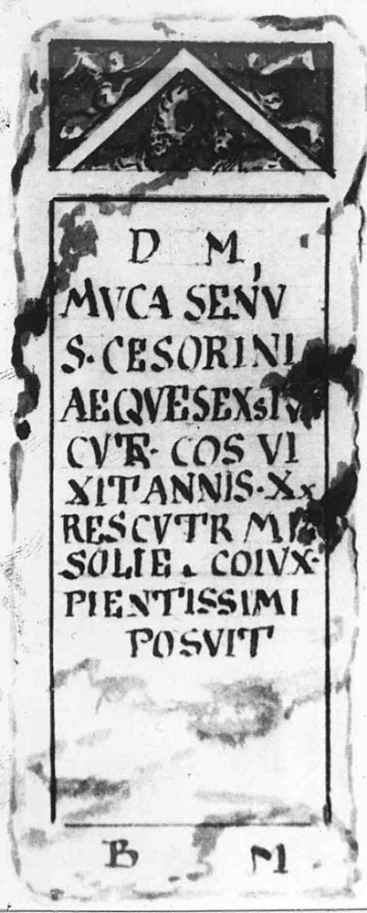 - D(is) M(anibus) / Mucasenu/s Ce(n)sorini / {a}eques ex sin/gul(ari) co(n)s(ularis) vi/xit annis XX / Rescuturme / Soi(a)e co(n)iux / pientissima / posuit / b(ene) m(erenti)