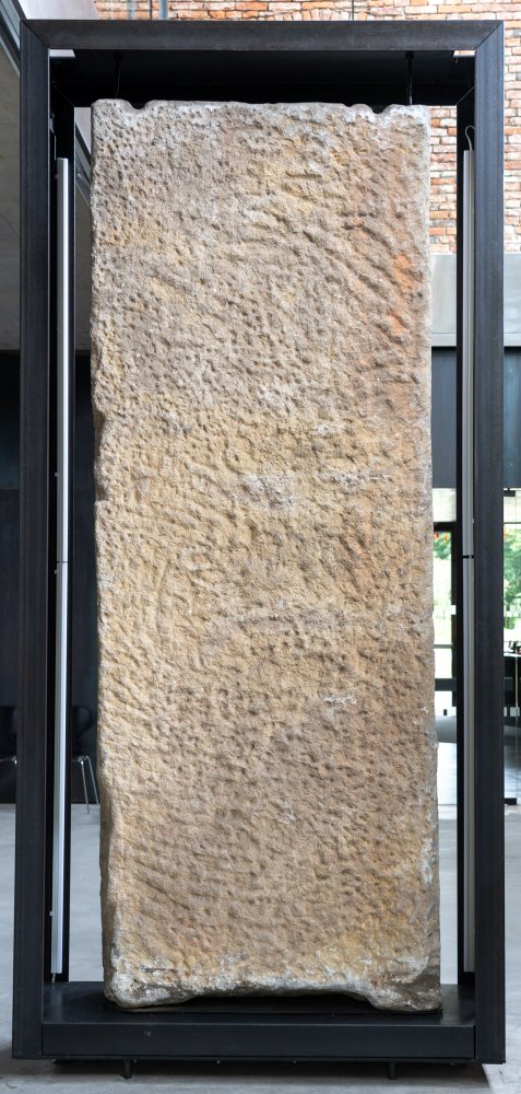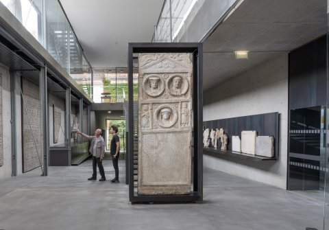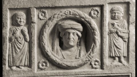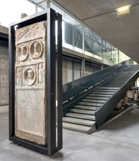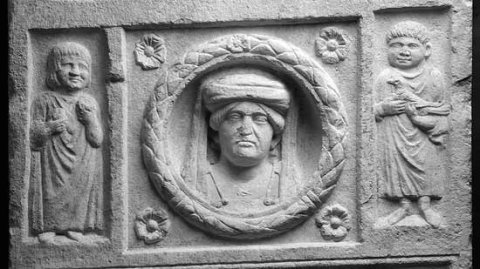 Unten in der Mitte Rechteckfeld mit Medaillon mit Büste einer einheimischen Frau: Modiushaube, Schleier, Fibeln. Seitlich Felder mit Ganzfiguren, links Mädchen: offenes Haar, lange Ärmeltunica, in den Händen Früchte. Rechts Knabe: Locken, Mantel (Paenula ?), in den Händen Vogel. Medaillons von Kränzen gerahmt, in den Zwickeln um die Medaillons Rosetten. - Inschrift