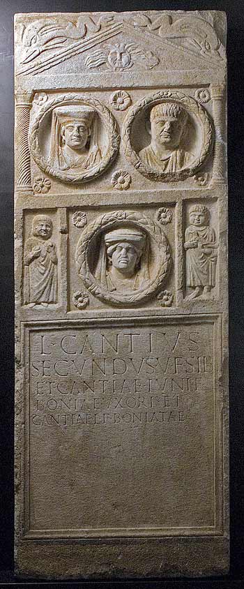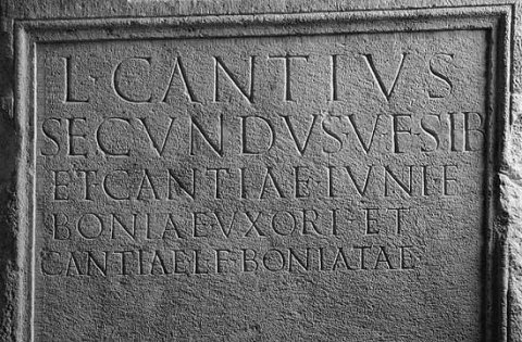 - L(ucius) Cantius / Secundus v(ivus) f(ecit) sib(i) / et Cantiae Iuni(i) f(iliae) / Boniae uxori et / Cantiae L(ucii) f(iliae) Boniatae
