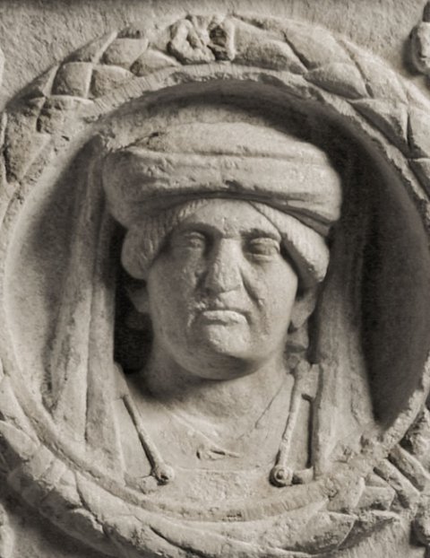 Eingeschriebener Giebel mit Gorgoneion, auf den Schrägen Delphine. Im Hauptbild Familie in zwei Bildfeldern. Oben zwischen Säulen mit Spiralkanneluren zwei Medaillons mit Büsten. Links einheimische Frau: Modiushaube, Schleier, Fibeln. Rechts Mann: bartlos, gesträhntes Haar, Mantel.