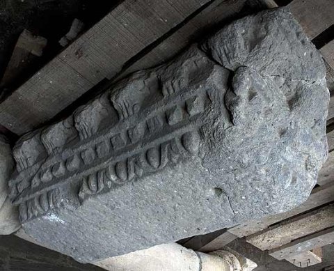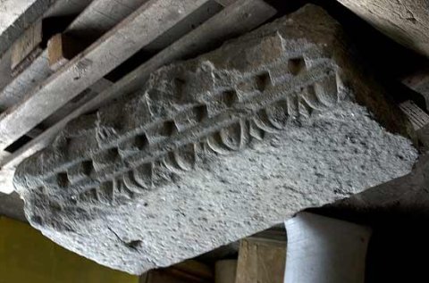 - An drei Seiten umlaufendes Profil: unten Blattkyma, dann Zahnschnitt, oben Konsolfries.