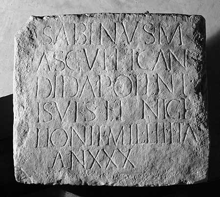 - Sabinus M/ascul(i filius) et Can/dida Potent/is (filia) v(ivi) f(ecerunt) s(ibi) et Nige/l(l)ioni f(ilio) mil(iti) l(egionis) II Ita(licae) / an(norum) XXX