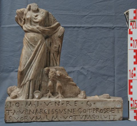 - Mythische Figur (Jupiter, Juno): auf der Basis mit Votivinschrift zwei stehende Ganzfiguren, zwischen ihnen Adler.