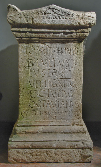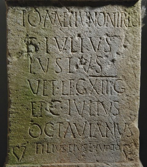 - I(ovi) o(ptimo) m(aximo) et Iunoni regi(nae) / C(aius) Iulius / Iustus / vet(eranus) leg(ionis) XIII G(eminae) / et C(aius) Iulius / Octavianus / filius eius ex voto