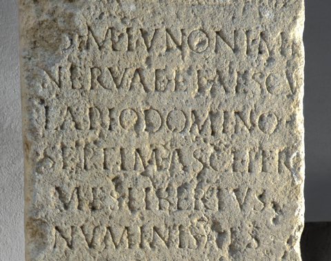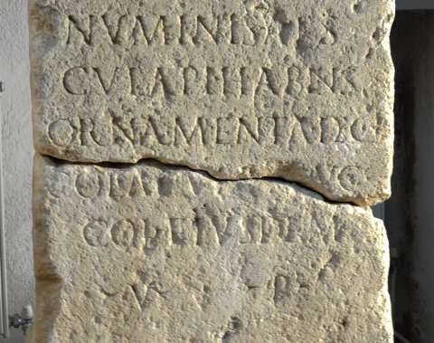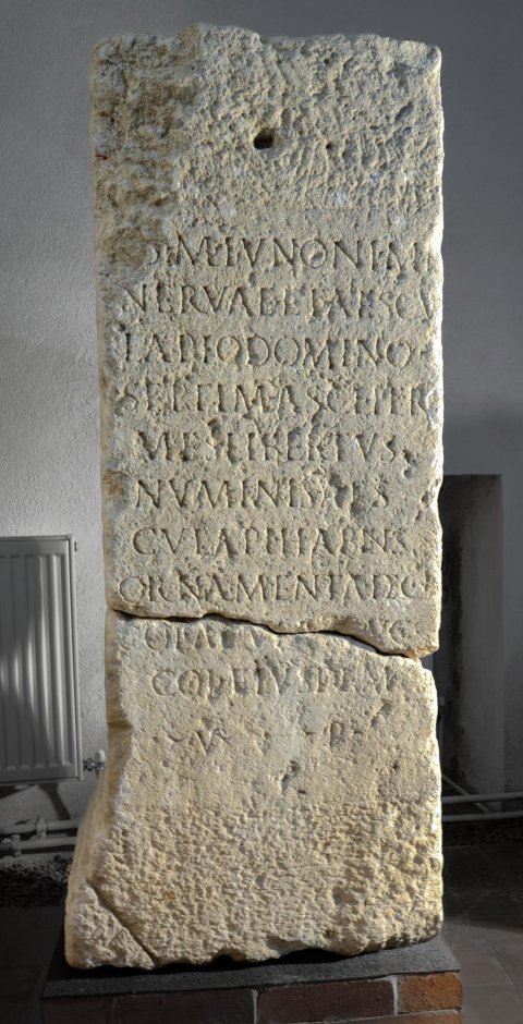 - [I(ovi)] o(ptimo) m(aximo) Iunoni Mi/nervae et Aescu/lapio domino / Septim(ius) Ascl(epius) Her/mes libertus / numinis Aes/culapi(i) habens / ornamenta dec(urionalia) / col(oniae) Apul(ensis) et Aug(ustalis) / col(oniae) eiusdem / v(oto) p(osuit).