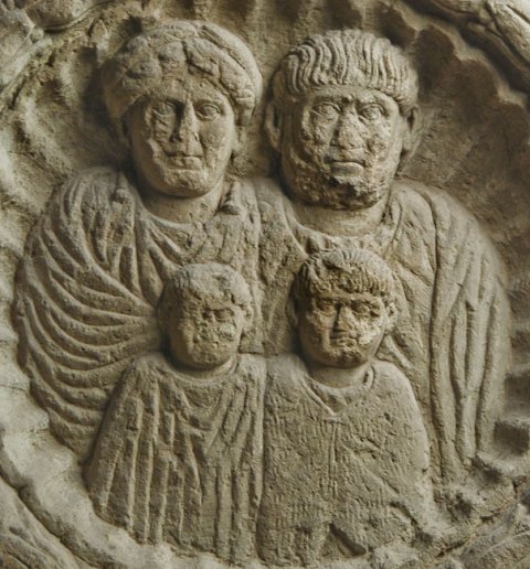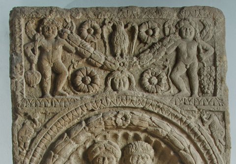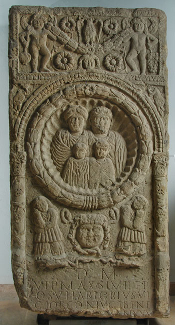 - Oben querrechteckiges Feld mit Kymation auf der Rahmenleiste, im Feld zwei girlandenttragende Genien (Eroten), der linke mit Mohnkapsel, der rechte mit Weintraube. Im Girlandenbogen Adler zwischen Rosetten, unter der Girlande weiblicher Kopf zwischen Rosetten. Im Hauptbildfeld Medaillon mit Lorbeerkranzrahmen, darin Muschelnische mit Halbfiguren einer Familie. Oben Ehepaar, links Frau in Tunica mit Fibeln und Mantel, rechts bärtiger Mann. Vorn Kinder (zwei Knaben im Mantel, der rechte mit Paenula). Unter dem Kranz Gorgoneion zwischen zwei tauernden Frauen (Dienerin ?) auf Standleisten. Außen Rankensäulen, die einen profilierten Bogen tragen. In den Zwickeln über dem Bogen Delphine.