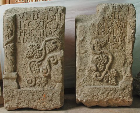 - Oben Genius mit Girlande und Kranz, Vogel und Rosette. Darunter Bogen mit Medaillon, darin drei Brustbilder einer Familie (Ehepaar und Kind). Über dem Bogen Weintrauben. Schriftfeld zwischen Säulen mit Weinranken, unter der Inschrift Krater mit Weinranken.