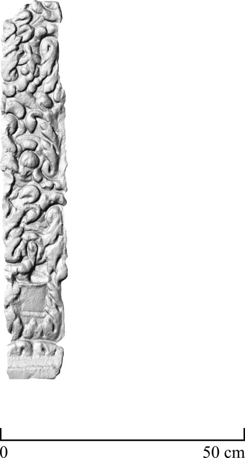 - Schmales hochrechteckiges Feld mit Gefäß, aus dem Akanthusranken wachsen.