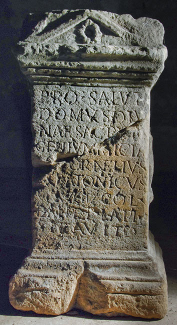 - Pro salute / Domus Divi/nae sacrum / Genium Miciae / M(arcus) Cornelius / Stratonicus / aug(ustalis) col(oniae) / et ante f(rontem) lapi(dibus) / stravit