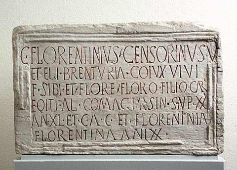 - C(aius) Florentinius Censorinus v(ivus) / et (A)eli(a) Brenturia co(n)iux vivi / f(ecerunt) sibi et Flore(ntinio) Floro filio car(issimo) / eq(u)iti al(ae) Comag(enorum) pr(imae) sin(gulari) stup(endiorum) (!) XX / an(norum) XL et C(aio) A(elio?) C (?) et Florentinia / Florentina an(norum) LXX
