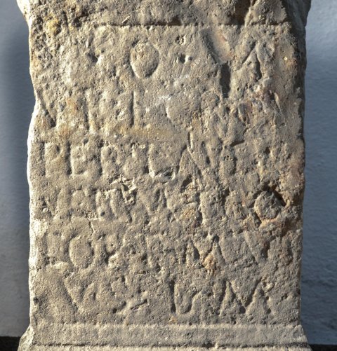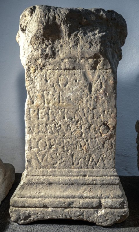 - I(ovi) O(ptimo) M(aximo) / vet(erani) et c(ives) Ro[m(ani)] / per T(itum) Aurel(ium) / Verum et Cor(nelium) / Fort(unatum) mag(istros) / v(otum) s(olverunt) l(ibenter) m(erito)