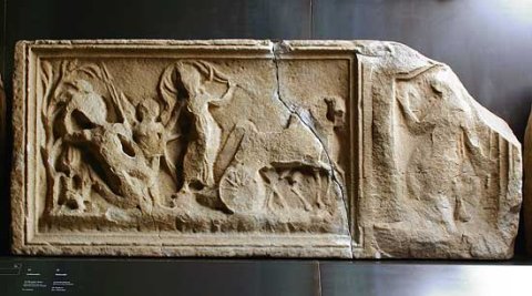- Mythos, mythische Figur, Musikinstrument: im rechteckigen Mittelfeld steigt Selene (Luna) von zweirädrigem Wagen mit Zweigespann, geführt von Eros (Amor), links unter einem Baum liegt Endymion, zwei Speere im linken Arm, neben ihm sitzender Hund. Im rechten Seitenfeld unter Giebel tanzende Mänade in Rückansicht, in der Rechten Stab, in der Linken Tympanon.