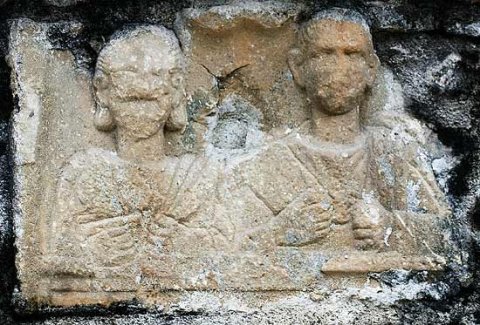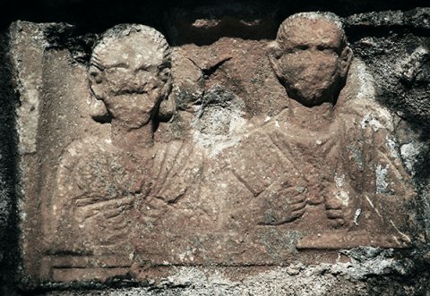 - Rechteckiges Bildfeld mit zwei Brustbildern (Ehepaar): links Frau in Tunica und Mantel, rechts bärtiger Mann in Ärmeltunca und Mantel. Fingerring. Unterer Rahmen profiliert (Ansatz des Schriftfeldes ?).
