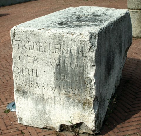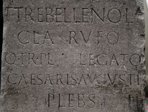 - T(ito) Trebelleno L(uci) f(ilio) / Cla(udia) Rufo / q(uaestori) tr(ibuno) pl(ebis) legato / Caesaris Augusti / plebs