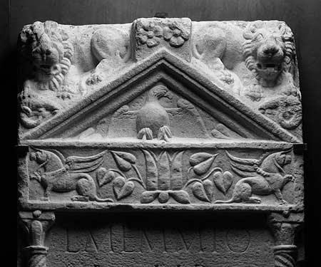 Im Giebel Adler mit ausgebreiteten Flügeln zwischen Efeublättern. Im Zwischenfries mythische Figur: Blattkelch mit Efeuranken zwischen Greifen.