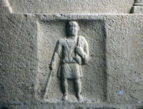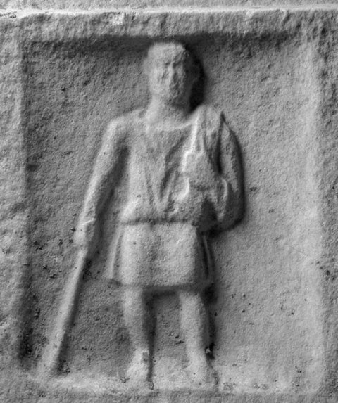 Im Sockelbild Diener: in Rechtecknische Ganzfigur eines Mannes (kurze Tunica, in der Rechten Stab, über der linken Schulter Tuch oder Sack). - Inschrift