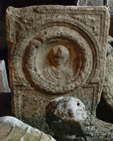 Im oberen, rechteckiges Feld mit einfachen Rahmen im Zentrum eine runde Porträtnische mit Büste eines Mannes in tunica und sagum. Rundum Blätterkranz und Arkade. Obere Zwickel mit Palmetten verziert.