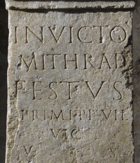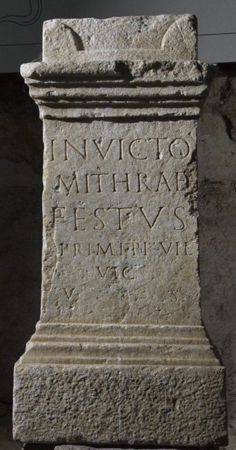 - Invicto / Mithrae / Festus / Primi p(ublici) p(ortorii) vil(ici) / vic(arius) / v(otum) s(olvit)