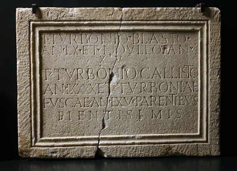 - T(ito) Turbonio Blasto / an(norum) LX et Nov(e)llo f(ilio) an(norum) / XV / T(ito) Turbonio Callisto / an(norum) LXXXX et Turboniae Fuscae an(norum) LXV parentibus / pientis(s)imis