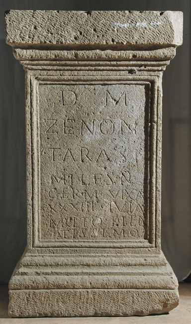 - D(is) M(anibus) / Zenon / Tarasi / miles n(umeri) / Germ(anicianorum) v(ixit) an(nis) / XXXIII Iulia / marito pien/tissimo