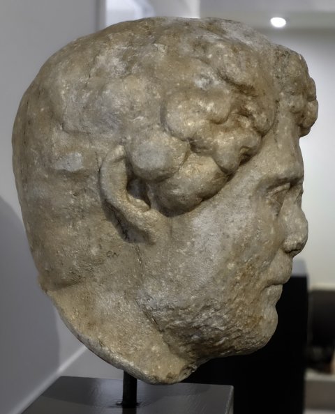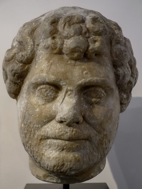 - Porträt eines älteren Mannes mit Lockenkranz um die Stirn. Im Gegensatz zum voluminösen Haar ist der kurze Bart nur gepickt. Die Augen sind gebohrt, die Augenbrauen betont. Die Gesichtszüge sind fleischig. Die Identifizierung als Hadrian, wie A. García y Bellido sie vorschlug, ist unwahrscheinlich.