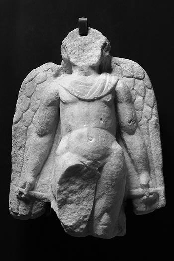 - Mythische Figur (Ikarus): lange Haare, Mantel zurückgeworfen, ausgebreitete Flügel mit Handgriffen.