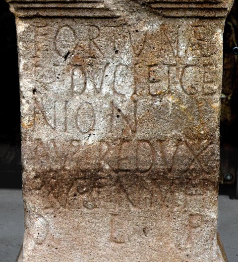 - Fortunae / Reduci et Ge/nio N(umeri) / Aur(elius) Redux / praef(ectus) N(umeri) M(aurorum) H(isp- ?) / d(onum) l(ibens) p(osuit)