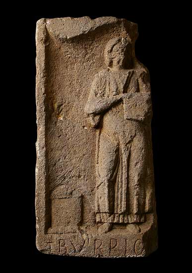 - Dienerin: in Bogennische oberhalb der Inschrift einheimisches Mädchen mit Ober- und Untergewand, im linken Arm Kästchen, neben dem rechten Fuß Korb.
