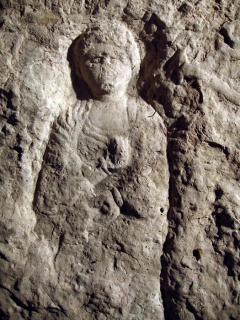 - In der linken Hälfte Figur einer Frau mit Umhang und Armreifen, in der Rechten Frucht. In der rechten oberen Ecke Umrisse von zwei kleineren Figuren. Werkstück eines Steinmetz-Lehrlings ?