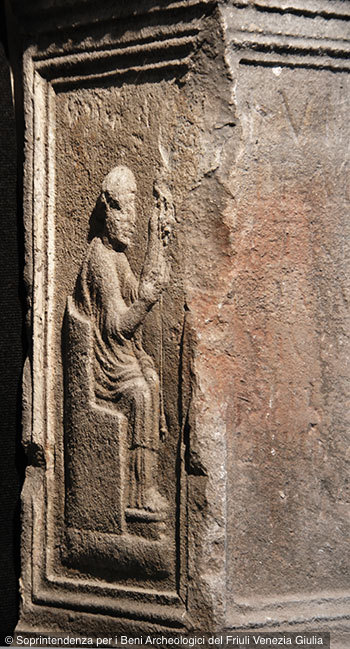 - Gerahmte Reliefs auf den Nebenseiten: links auf einem Sessel sitzende Frau in Mantel und Tunica, in den Händen Spindel, rechts auf flacher Standleiste stehender Mann in Tunica und Toga, in der Linken Rolle (volumen). Schriftfeld auf der Vorderseite profiliert gerahmt, an Rand der Deckplatte Profil mit Zahnschnitt an drei Seiten.