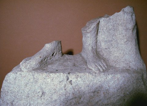 - Mythische Figur (Asklepios-Aesculapius): Füße einer stehenden Figur, neben dem linken Fuß Rest der Baumstammstütze mit Schwanzende einer Schlange.